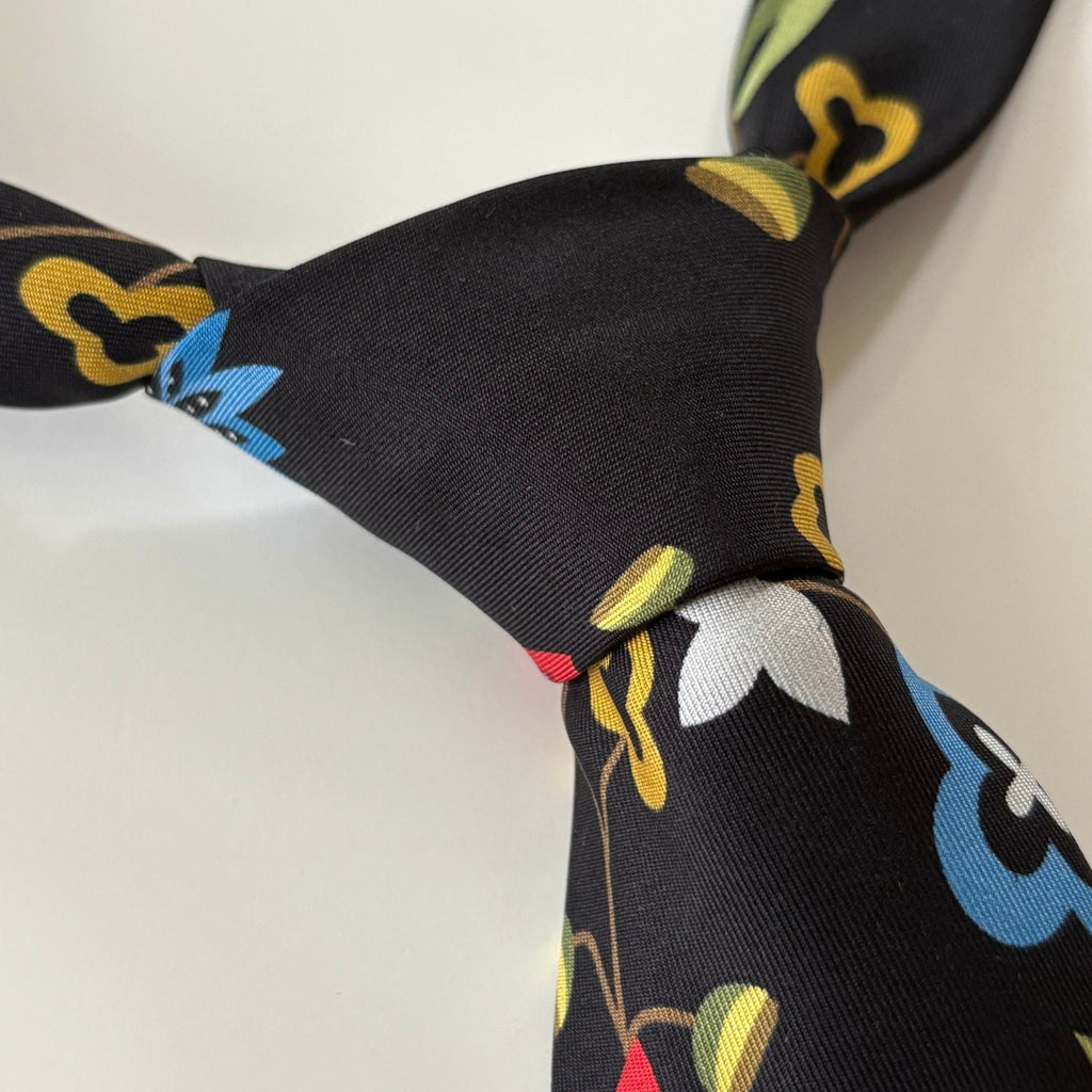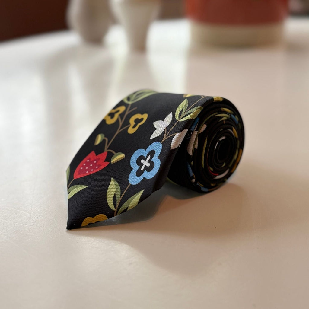 The Rogaland Black tie is inspired by the iconic black variation of the Rogalandsbunad, featuring colourful, intricate floral patterns.