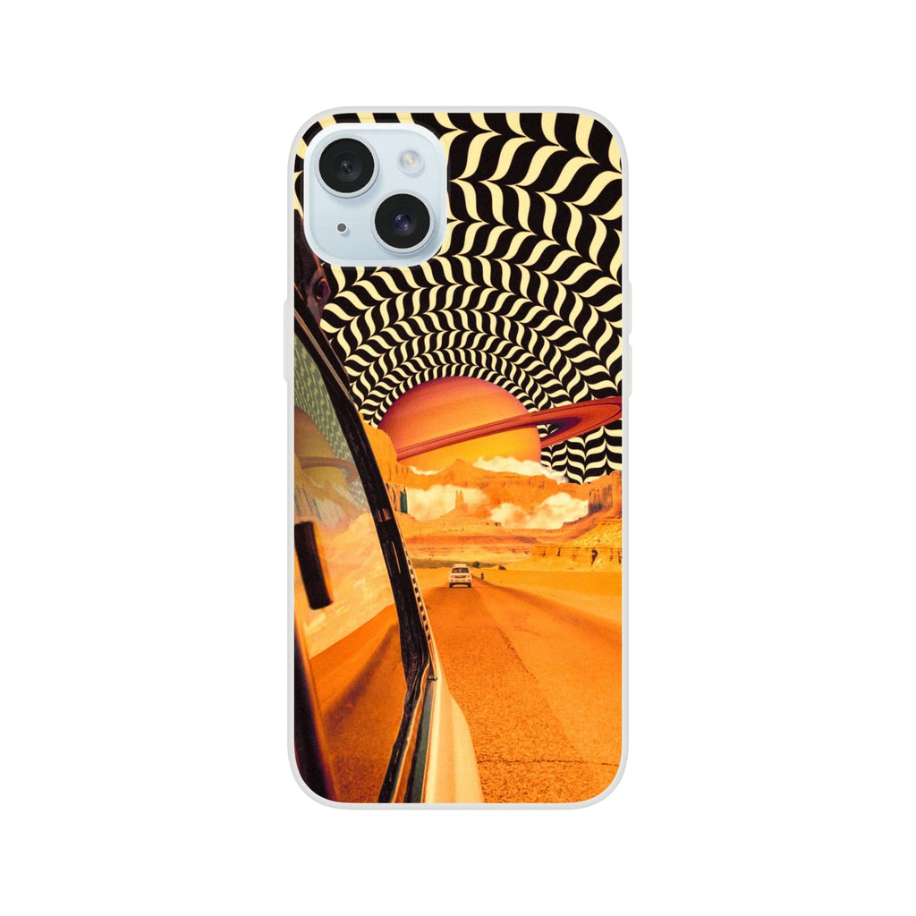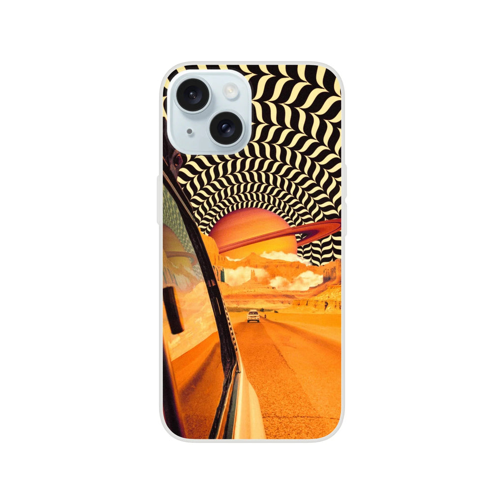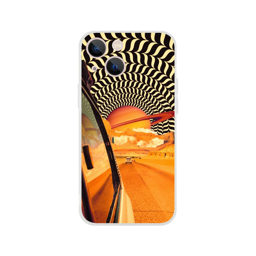 The âReal Road Tripâ iPhone case features a surreal retro-futuristic landscape where Saturn hangs over a desert highway. A bold, vintage sci-fi vibe for dreamers, travellers, and lovers of striking phone art.