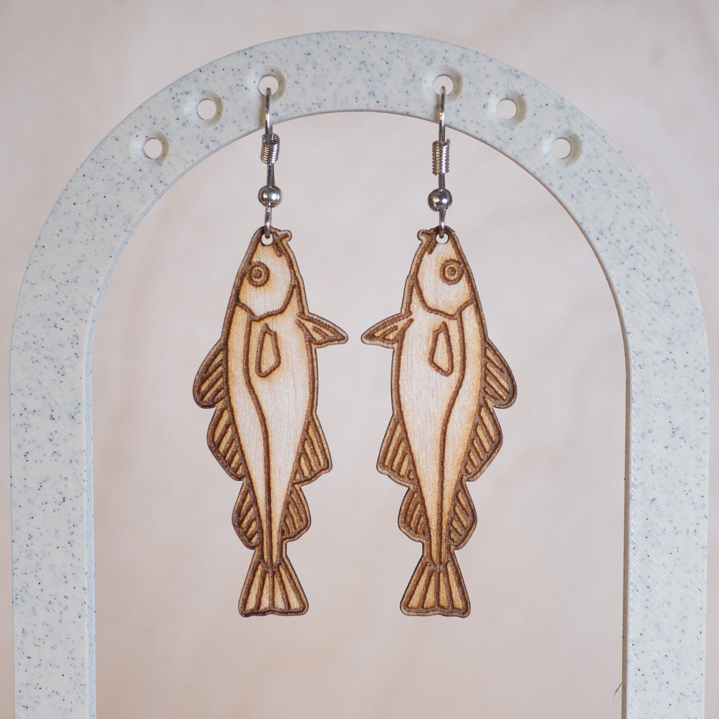 Våre torske-øredobber er en unik måte å uttrykke din kjærlighet til havet og dets skapninger. Laget med omhu i kryssfinér, denne øredobben har en lengde på 50mm.